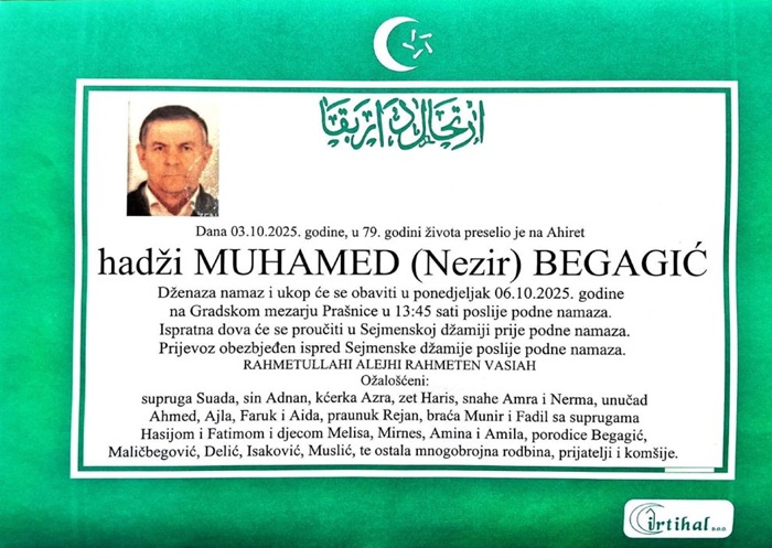 Na Ahiret preselio Muhamed Begagić, bivši predsjednik Nogometnog saveza Zeničko-dobojskog kantona. https://www.zenicablog.com/muhamed-begagic-preselio-na-ahiret-dzenaza-u-ponedjeljak-na-prasnicama/